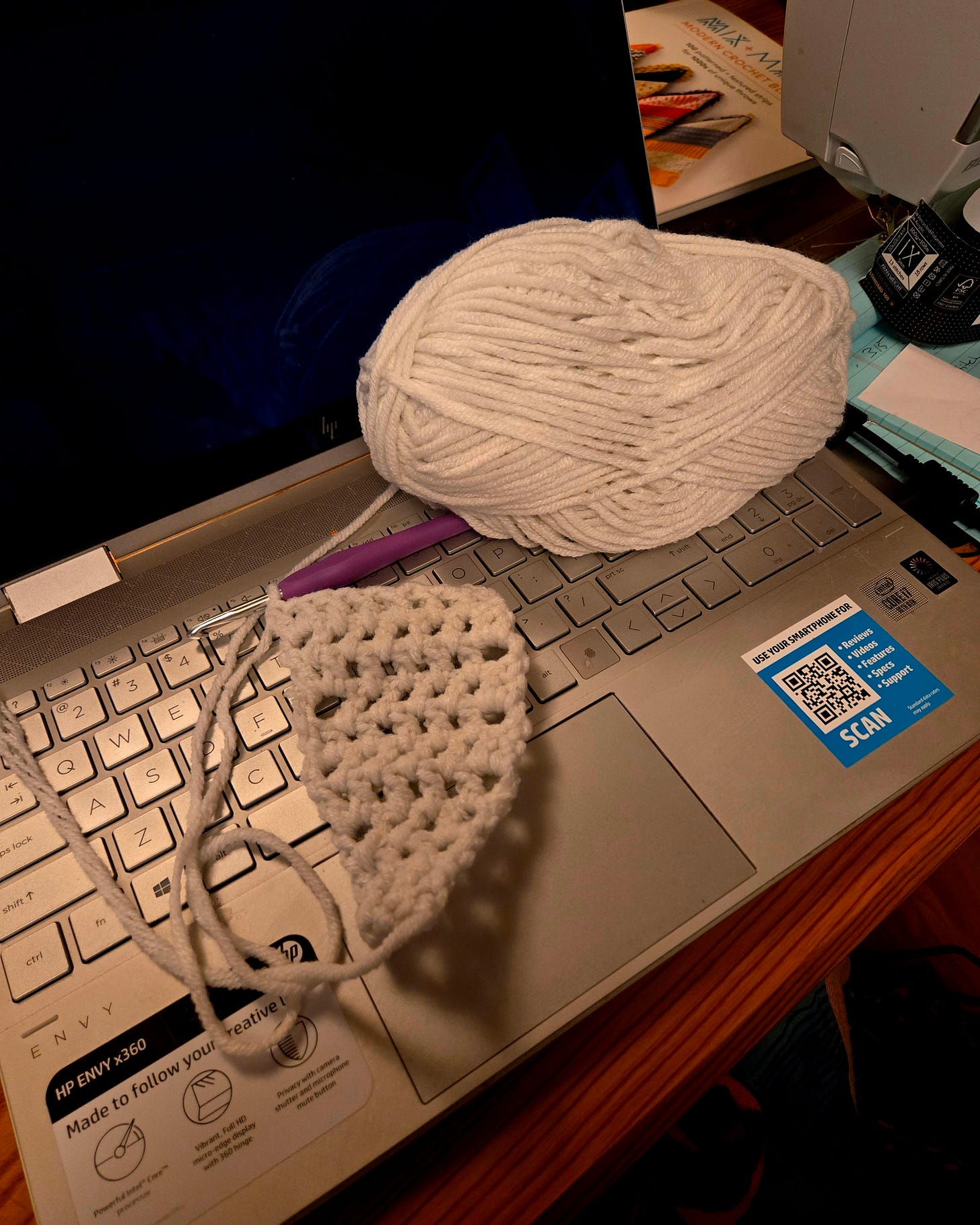 I decided on the Desert Winds Scarf. It is a free pattern from Make & Do Crew. I will use all three colors. Not sure when I will change colors yet. I think I’m going to make the fattest part out of the blue. Then the two sides will somehow be white and pink.